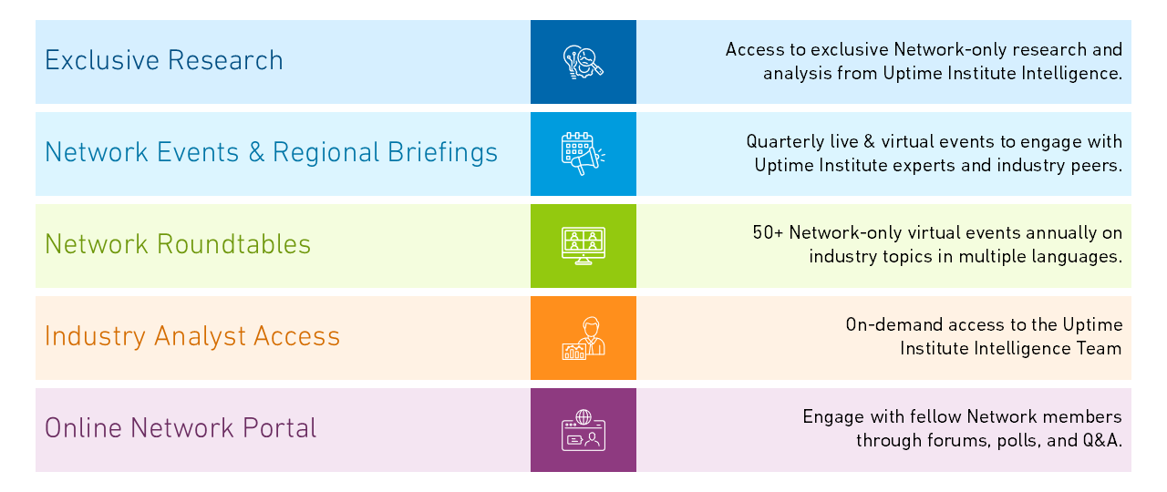 As a member of the Uptime Network, you will gain full access to Uptime Institute Intelligence in the form of Intelligence Reports, Discussion Forums, Network Roundtables, and access to our Uptime Network Portal.